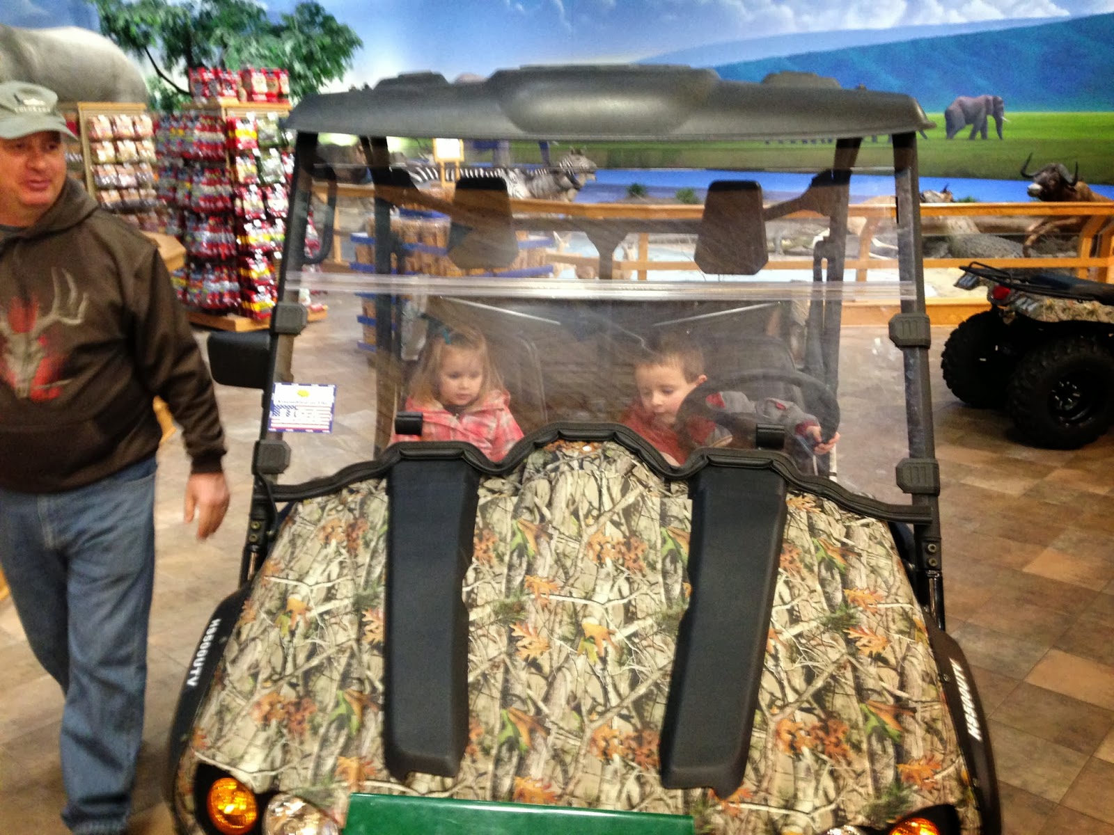 Today I drove the kids down to PA to stay at my parents for the next 10 days or so while I am recovering from surgery. My Dad helped me shave about 90 minutes off my travel time by meeting me at (Cabela's). It 's a huge store filled with everything outdoors related. It has been way to long since I've been there with the kids as we normally do a quick stop in NJ when we drive to my parents but this was a perfect opportunity for the kids to see some animals and stretch our legs.